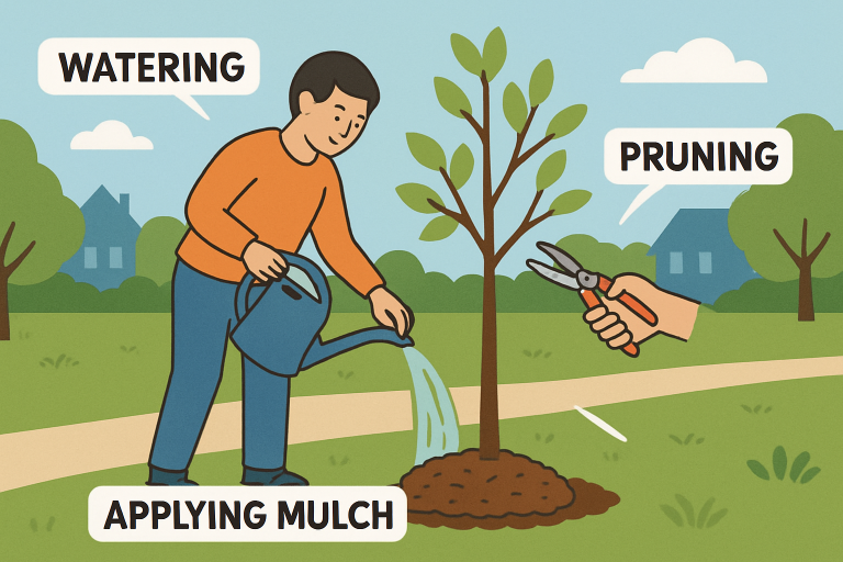 - Regular watering, especially for young trees, is crucial for their growth.